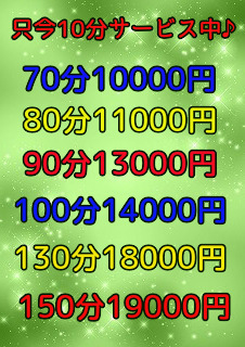 [06/03 10:24]只今10分サービス中!!! 60分→70分→10,000円 70分→80分→11,000円 90分→100分→14,000円 120分→130分→18,000円